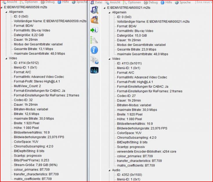 Im Anhang ein Bild! Auf diesem sieht man 2 Stream! Denn, Fab rechnet den Film 2mal! Einmal für das linke und einmal für das rechte auge! Man hat also zweimal den kompletten Film drauf! Das sieht man ja das beide 1h 29 lang sind! Beide haben Full HD Auflösung....nur das zweite File (links im Bild) hat nur 8 GB und dadurch nur 12,6 Mbits!!! Das ist schon verdammt wenig. Außerdem sieht man das oben steht "multiview count 2"! Das sind also Ansichten die dann übereinander gelegt werden! Das ist was völlig anderes als eine 3D Bluray im original! Dort liegt der Film nur einmal vor! Also Fab macht hier was völlig eigenes...ob das mit dem 3D der originalen überhaupt was zu tun hat ist fraglich. Und selbst wenn, was durchaus sein kann, bekommt ein Auge ein stark komprimiertes Bild ab! Im Falle von Monster in Paris hat das original 26 GB! Das eine Auge bekommt also ein komprimiertes Bild von 26GB auf 8GB!!! Das teste im die Tage mal im 3D Modus....wenn man die Augen immer einseitig schließt ob ein Bild schärfer ist als das andere!