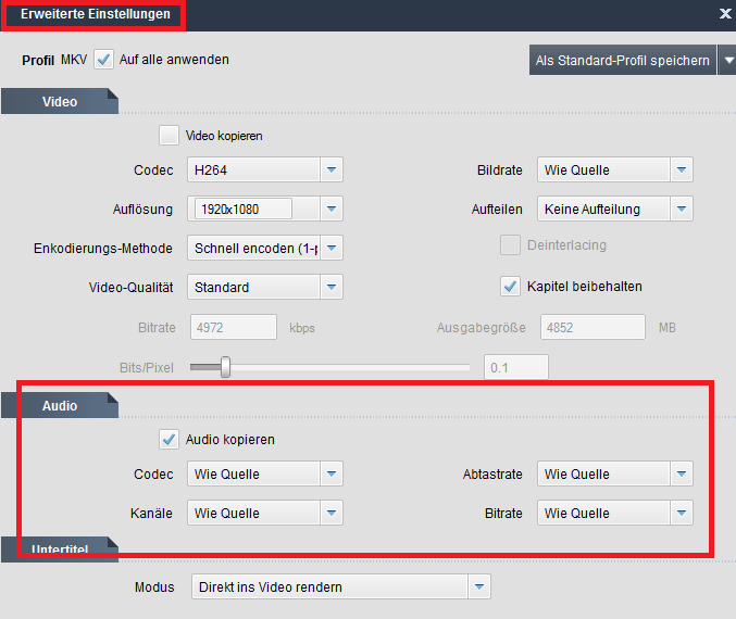 Unter Erweiterte Einstellung den Haken bei Audio kopieren setzen siehe Bild 1.