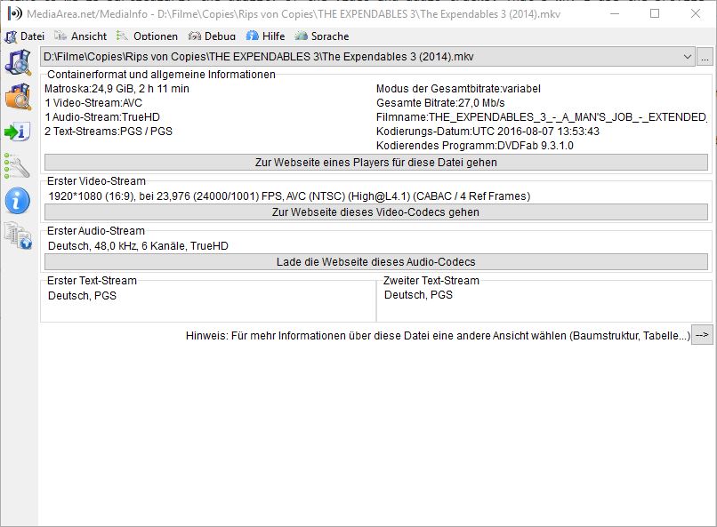 Gestern habe ich von meinem Film "The Expandables 3" mit DVDFab Bluray Ripper eine MKV Datei erstellt. Als Profil habe ich "MKV Passthrough" genommen. Auch in den Audioeinstellungen habe ich "Audio kopieren" angewählt. Nach dem DVDFab fertig war habe ich die MKV-Datei mit MediaInfo ausgelesen und musste feststellen das nur noch eine Dolby True HD Tonsnpur mit 6 Kanälen vorhanden war. Zumindest konnte ich keine Informationen dazu finden das es sich um eine 7.1 Tonspur handelte. So wie es mir erscheint konvertiert DVDFab die originale Dolby True HD 7.1 (Atmos) Tonspur zu einer normalen Dolby True HD 5.1 Tonspur.
