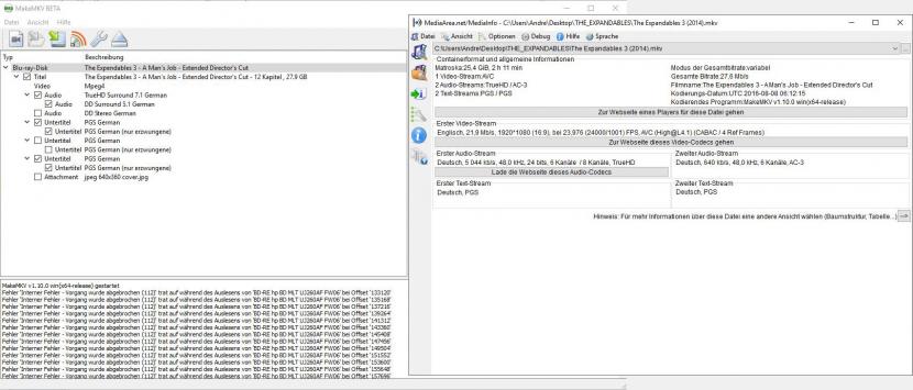 Dann habe ich eine MKV Datei mit Make MKV erstellt und diese Informationen durch MediaInfo erhalten: