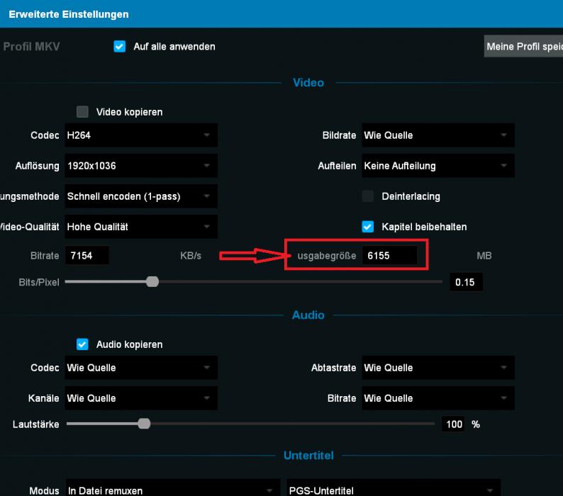 Die Ausgabegröße war auf 6155 MB Eingestellt.