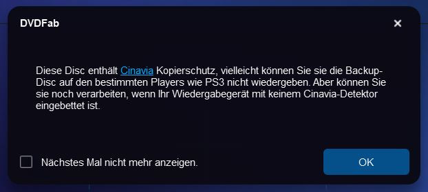 Nun habe ich BD. Wenn ich diese einlege, bekomme ich einen Hinweisdialg, das die BD einen Cinavia-Schutz enthält.