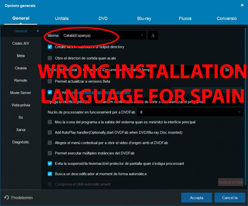 Claramente, DVDFab no debe seleccionar Catalán a menos que la PC de instalación esté configurada para este idioma.