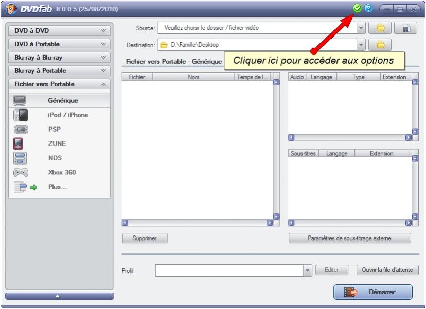 Les options de DVDFab pour ma carte :
