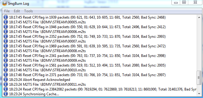 Running latest final DVDFab and I created a full copy protected disc. IMGBurn is not showing me a log of this burn but it writes the whole movie successfully but will not play in PS3/Panasonic BTT750. I wish I wrote down exactly what IMGBurn was writing in the log during burn but I forgot...Something along the lines of M2ts bad sync and some numbers and keeps repeating throughout.