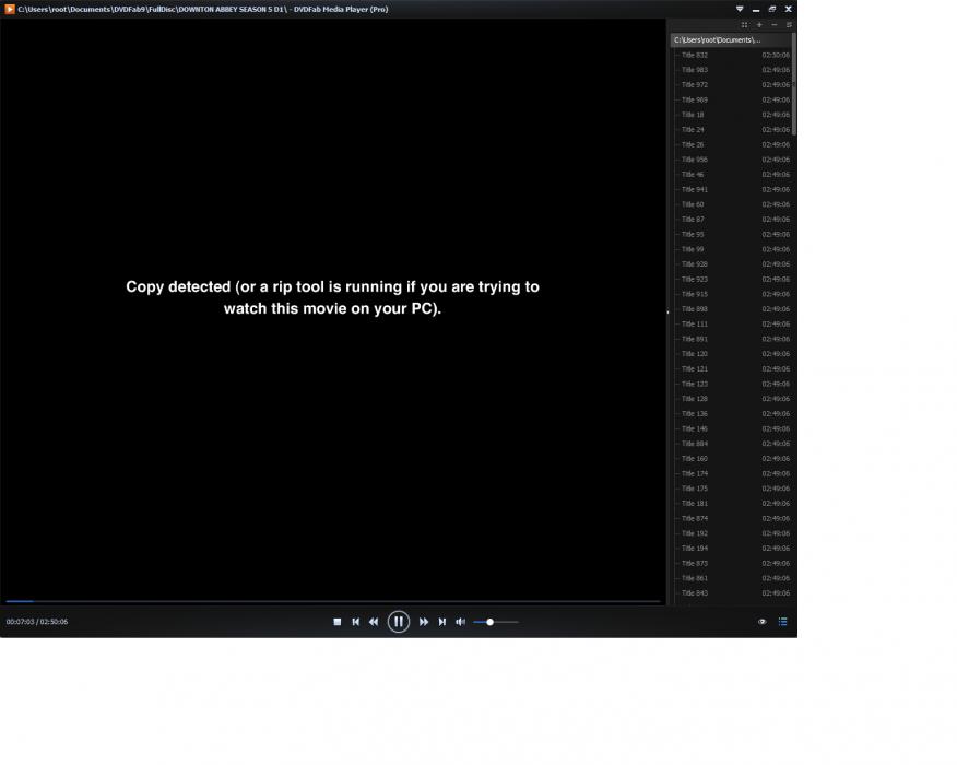 Playing backup of Downton Abbey S5 BD, 7 minutes into it, the screen goes black with message Copy Detected (or a rip tool is running if you are trying to watch this movie on your PC). Also the menu seems to be wrong. Had no problems doing backup with 9.185?
