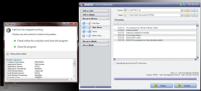 Hey CBR. Okay so I reinstalled DVDfab by right lcicking the installation file and selecting "Run as Administrator." I just tried to rip my District 9 disc and I'm still getting the same damn error! I think it has something to do with this DXVA crap. Even when I UNCHECK it in the DVDfab settings it still says that it's enabled in the live log as it's ripping. I don't know what to do AHHH