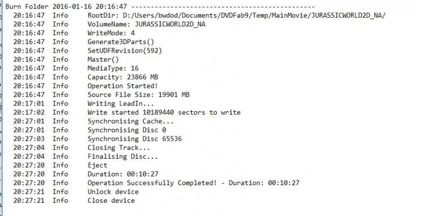 You have supplied the burn folder. I need the DVDFab internal log session from Jurassic World. See the link in my sig for instructions. The name of the file that contains the log session is "dvdfab_internal.log", which you can open and edit with Notepad to extract the needed log session. A log session begins with the DVDFab version number and date and ends with blank lines. The most recent ones are near the end of the log file.