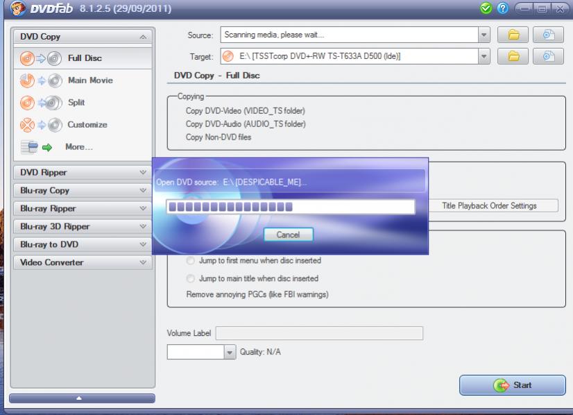 I tried to copy "Dispicable Me" with the newest version installed and although it will play on both my DVD player and on computer, when I attempt to open to copy i can't get past the initial scanning. I have tried to open disc for 10-15 min. without anything happening. The only way to close the scanning attempt is to open the "Windows Task Manager" and then close it that way. I have tried a search here on the forum but most posts are from '09. If this is a repeat post, I'm sorry, and please guide me to the proper post.