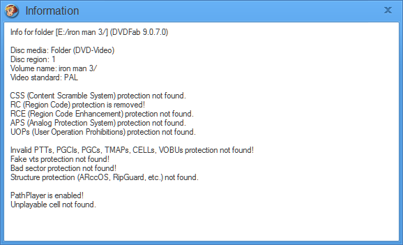 Info for folder [D:/X_DVDFab/FullDisc/CAPTAIN_AMERICA/VIDEO_TS/] (DVDFab 9.1.6.4) Disc media: Folder (DVD-Video) Disc region: 1 Volume name: CAPTAIN_AMERICA/ Video standard: PAL CSS (Content Scramble System) protection not found. RC (Region Code) protection is removed. RCE (Region Code Enhancement) protection not found. APS (Analog Protection System) protection not found. UOPs (User Operation Prohibitions) protection not found. Invalid PTTs, PGCIs, PGCs, TMAPs, CELLs, VOBUs protection not found. Fake vts protection not found. Bad sector protection not found. Structure protection (ARccOS, RipGuard, etc.) not found. PathPlayer is enabled! Unplayable cell (vts:3 title pgc:1 cell:1) is removed. Unplayable cell (vts:8 title pgc:2 cell:1) is removed. Unplayable cell (vts:8 title pgc:3 cell:1) is removed. Unplayable cell (vts:8 title pgc:4 cell:1) is removed. Unplayable cell (vts:8 title pgc:5 cell:1) is removed. 5 unplayable cells are removed.