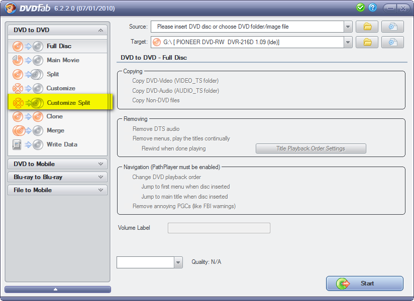 Registered user of DVDFab, v 6.2.1.8, DVD to DVD mode. I have never had problems setting up to split a movie with DVDFab, but I am having problems with Schindler's List. The original has the movie on sides A and B, just side A loads to 'main movie' at 67%, but when I click to split mode it does not show the tracks that will go to which disc, how much memory to each disc, etc. All of that info is blank.