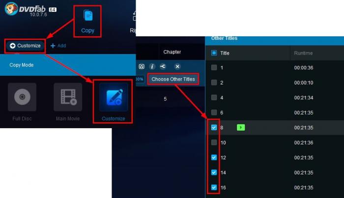 Once you've selected it, DVDFab will recognize the longest video as main movie. To get the other episodes, click on the "Choose other titles" button. Now you can select all of the episodes you want. That's it.