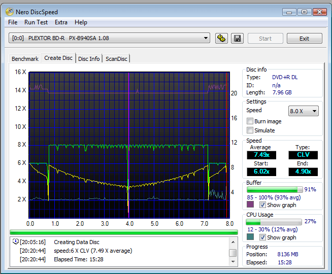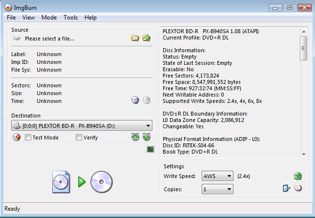 OK, well I'm using AWS and I just set the media to 2.4x to be safe until I can figure out what's the best speed to use. I used Nero DiscSpeed test on the Maxell Disc at 8x. But I don't understand the results. I used a blank disc and used the create disc test plus the other tests. I have both Maxell and Sony DL discs. I'm posting pictures of both the test results and my setup on ImgBurn, so maybe it will be easier to see what's going on. Maybe someone can help me make heads or tails of this. Thanks!