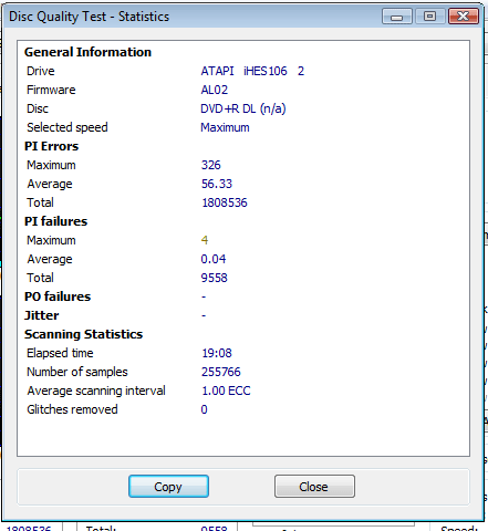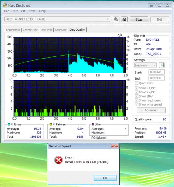 Well, the Disc Quality tab wouldn't appear until I replaced one of my Plextor drives with the Lite-On drive. For some reason the software won't support Disc Quality with the Plextor drive. I ran the quality test for the Sony DL Disc I burned at 8x speed. It asks you what speed to run the test at, and I wasn't sure, so I ran it at the maximum speed. Can I run a quality test on the Lite-On drive for a disc I burned with the Plextor drive? What speed should I run the test at? I also got an error before the test finished and I don't understand if the results were good or bad for the test. Do you know what the CDB error is all about? I'm also trying to figure out how to update the firmware for the Lite-On drive. Lite-On emailed me some software called SmartPack Utility and they said that would tell me if my firmware needed to be updated and would update it for me, but I can't figure out how it works. Do you know? Here are the pictures. Thanks!