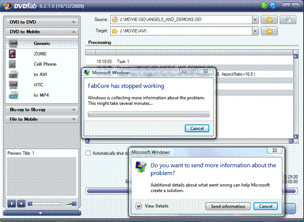 The /SUBTILE batch command line problem is fixed but there is a new problem that causes Fabcore to crash at the very end of the DVD2Mobile. The conversion completes but errors out prior to the /CLOSE