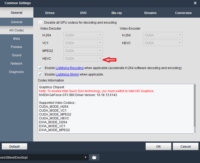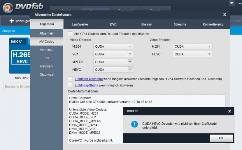 Please use your own pictures, this causes confusion. Please check the log folder and attach the fabcheck.log file, also the most recent log session in the DVDFab internal log. You might try rolling back to the driver shown in the DVDFab capture. instructions for attaching logs are linked in my sig, below. What Source do you have that requires HEVC decoding?
