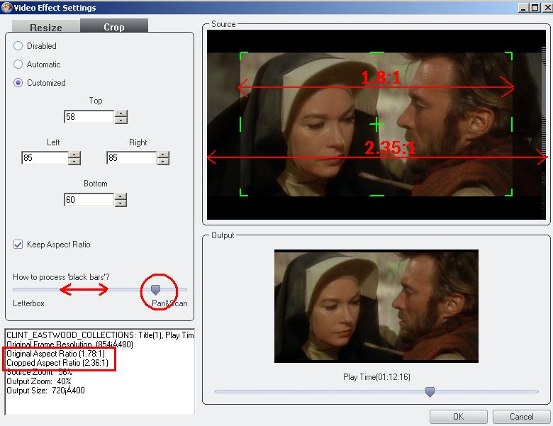 So I go into the crop tab on the video effects panel and hit the "custom" button. I have determined the values I think I want are 126 for the sides and 70 for the top and bottom. Now my question is, do I want to check the "keep aspect ratio" button? and what about that Pan&Scan slider?