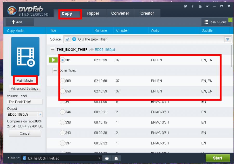 Here is why I don't do as you do please note this movie THE BOOK THIEF has 3 titles with same run times,chapters and soundtracks there's no way you will know which is the correct title to use when making main movie.This is just one example if you make the movie with the wrong title the movie may contain the movie out of order if you didn't see the movie before you may not even know it's out of order.Fab picks one of the 3 but is it the correct title? Only watching the whole movie can you tell.Other variants of this is one of the 3 or more titles will be one second less in time Fab will pick that title and it will be the wrong title.Others variants will have the correct title hidden from viewing so just keep this in mind with the newer releases.Last edited by glenns; 06-26-2014, 07:26 PM.