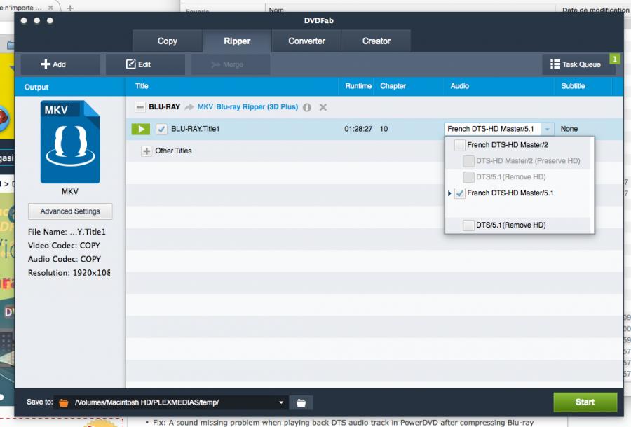 When I try to look at available audio tracks on a french bluray disk with only one track, the dialog is opened but DVDFab then freeze.