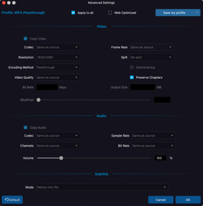 Sorry I'm not sure what Main Movie or Full Disc mode is. Here are some screenshots of my settings.
