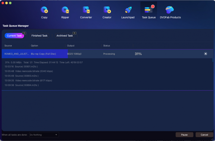 Tried to rip a copy of Romeo and Juliet Blu Ray (1996). The rate will gradually slow and slow till it hits zero and stops at 3%. This is after I updated to the new version of DVDFab.