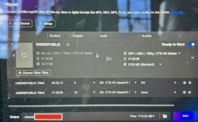I'm running DVDFab for Mac (v13.0.1.1) All-In-One on my Macbook Air, M1, 2020, Sonoma 14.3.1, and attempting to rip the Blu-ray disc for a OneRepublic concert. I'm just doing this straightforward and ripping directly to my laptop: