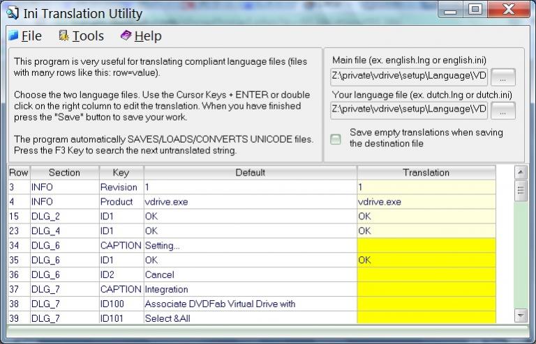The program has also a feature very usefull - <Tools> - <Show only untranslated strng> view only the empty string (bright yellow) and string equal to english (light to yellow) and hide other strings.
