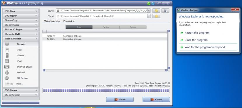 However, I do notice that when DVDFab get's stuck at 100% my CPU load goes to idle (0-2%) and downclocks itself since the comptuer is just sitting their for 40 minutes twiddling it's thumbs.
