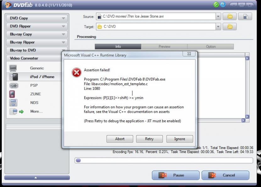 Just updated to 8.0.4.0 and the video Converter has 3 major bugs in it. Doing a 2 pass divx .avi to ipod creates a Expression (P[1][1] >>shift) >=ymin error then crashes the program. Audio of any divx to iPod conversion doesn't map the sound track correctly and m4v files are not supported as downloaded from itunes. I just tried a video converter from divx to iPod with 2-pass encoding to ipod.h.264 and it hung. I had to kill the process. Where are the DVDfab testers? I could understand if this were a free product but it's not!