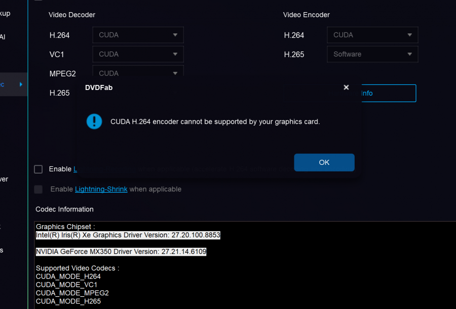 I canīt use CUDA or Intel Quick Sync for both H.264/H.265, the only option available is SOFTWARE.