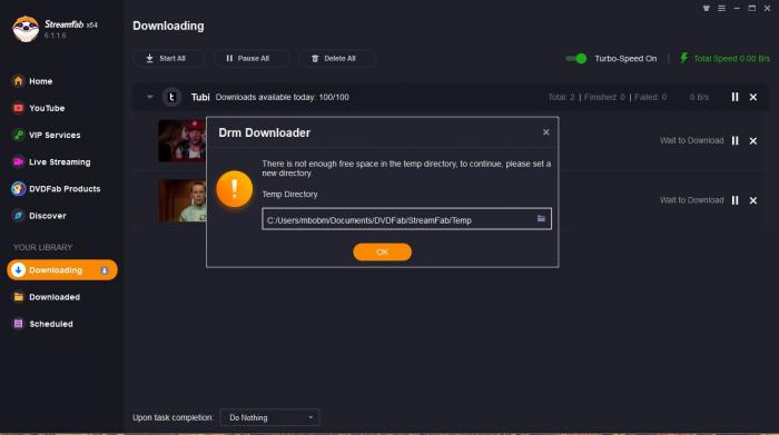 I am getting a Drm Downloader error when trying to download on Tubi and Amazon, "There is not enough free space in the temp directory, to continue, please set a new directory." There is ample room in it! Click image for larger version