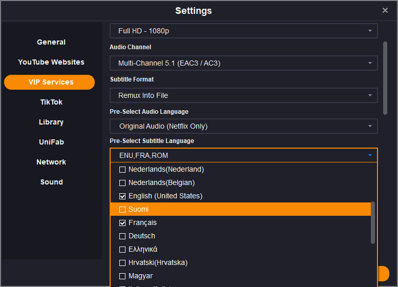 The Original Audio (Netflix Only) should be moved to the Netflix specific settings. Right now, because it is for ALL modules, if you only choose that setting, then StreamFab cannot select the English Audio in other modules with multiple languages, ie. Amazon: