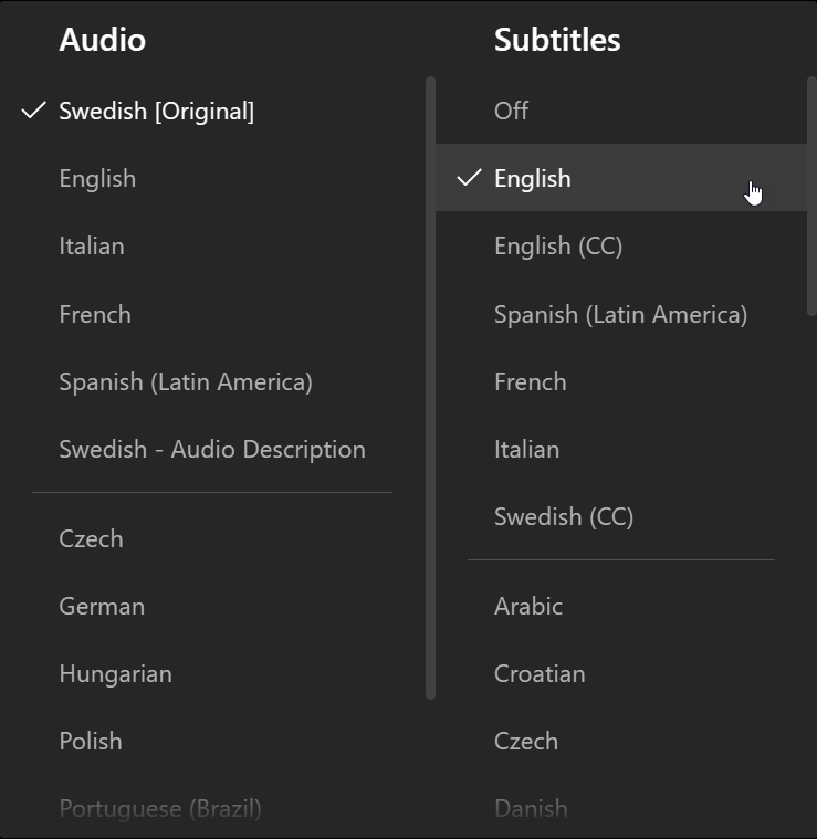 Notice on the image above that there are 2 English tracks named the same. This happens with a lot of Netflix movies or shows. In a browser, there is only 1 regular English subtitles and 1 CC: