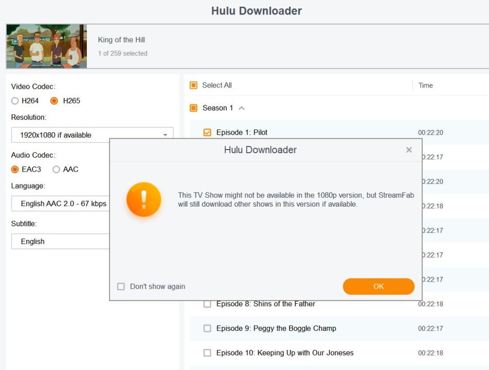 When I try to download a show that is available in h265, looks like the program defaults to h264. When I select h265, it analyzes forever.