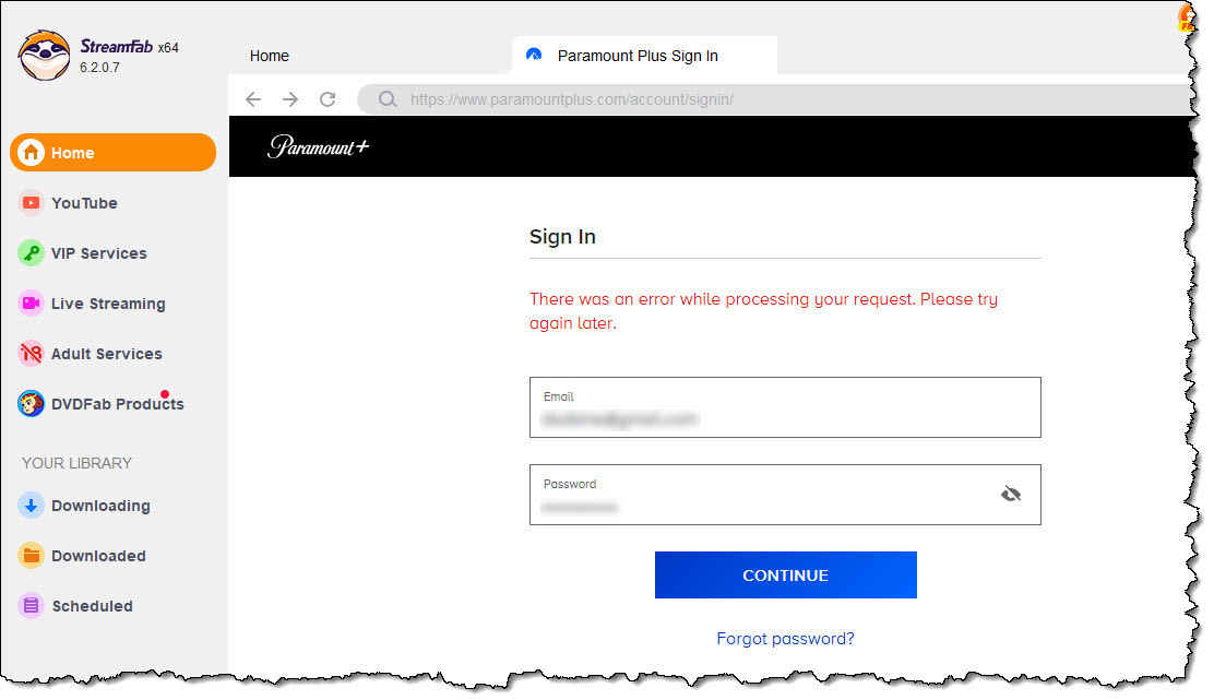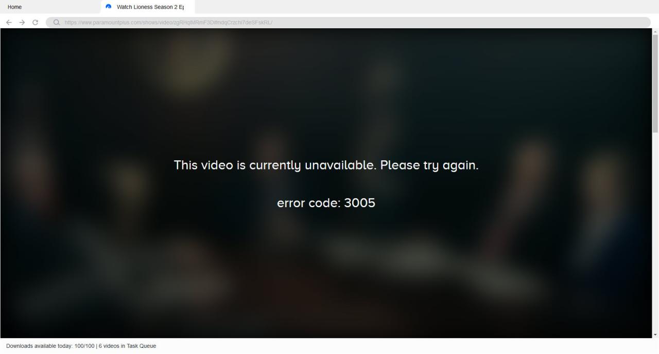 I then deleted the contents out of the Log and Temp directories, started 6207 back up, logged into Paramount+, and tried again. This time I got a different error message: