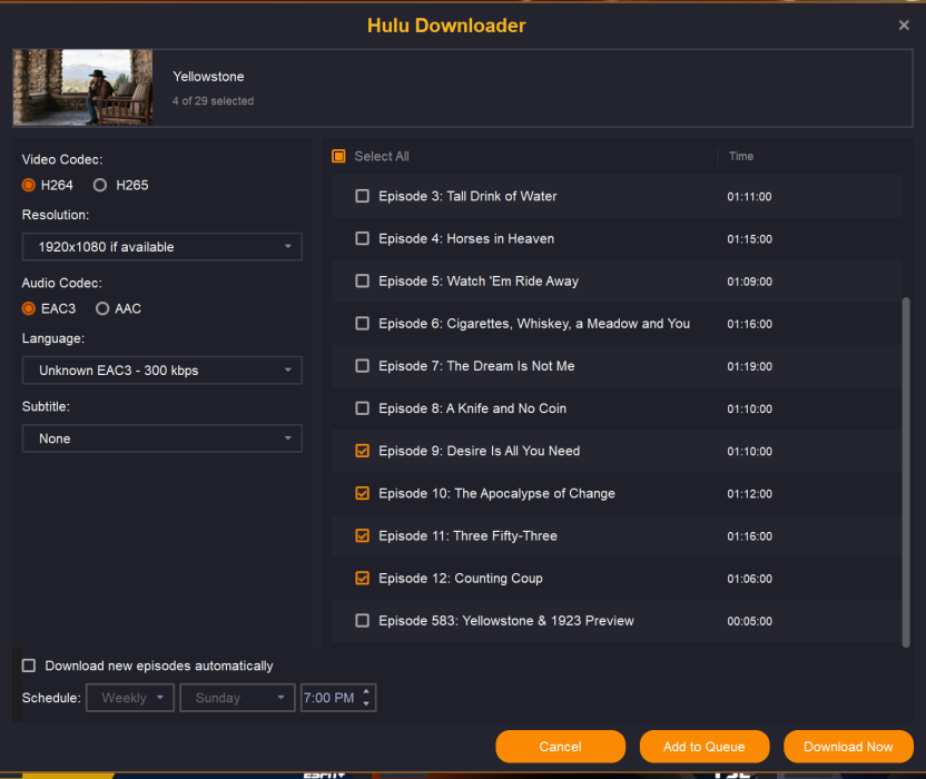 Go to Yellowstone Season 5. Choose Episodes 9-12 and add to queue. When you go to download now, the episodes do not download completely and have commercials or they are just the preview of what happened the week before.