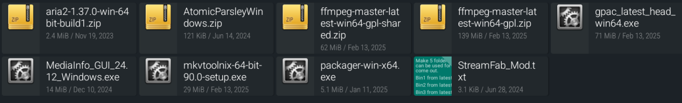 FFmpeg: I use two types of nightly FFmpeg files, just like StreamFab does. I use a shared type and a non-shared (static) type. If you don't know what the difference is, don't worry about it. Both types have been compiled by BtbN. As I said, I use the nightly GPL version, which means that they are updated every day with the latest changes and fixes. You can get both types from https://github.com/BtbN/FFmpeg-Builds/releases. You want to take the Master type files, which will give you the most mature and stable version. The files you want are ffmpeg-master-latest-win64-gpl.zip and ffmpeg-master-latest-win64-gpl-shared.zip.