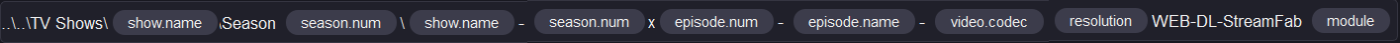 ..\..\TV Shows\show.name\Season season.num\show.name - season.numxepisode.num - episode.name - video.codec resolution WEB-DL-StreamFab moduleMy Download path is Z:\SF and the setting