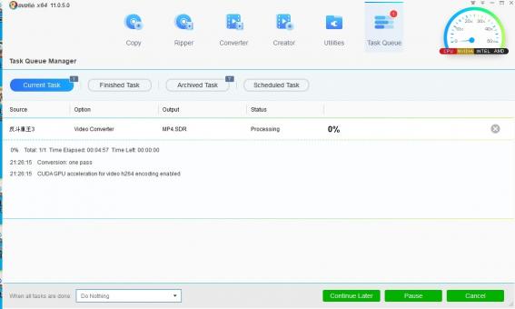 The new meter in the top right of the screen says CPU and "NVIDIA hardware accel is used". But converter file elapsed 15 min conversion ratio is 0%. What happened?????