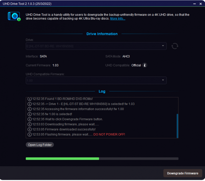 Hello, I am downgrading the firmware 1.03 of my new LG WH16NS60 purchased from Amazon, and it comes with firmware 1.03, the issue is that it takes more than 50 minutes with the progress bar in the middle, it is normal or it may be stuck. Attached log. Thank you